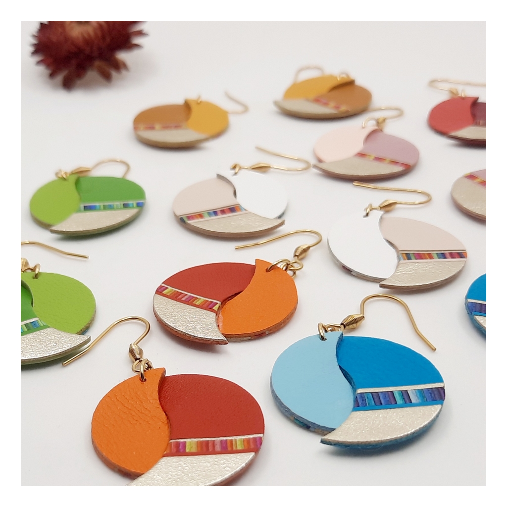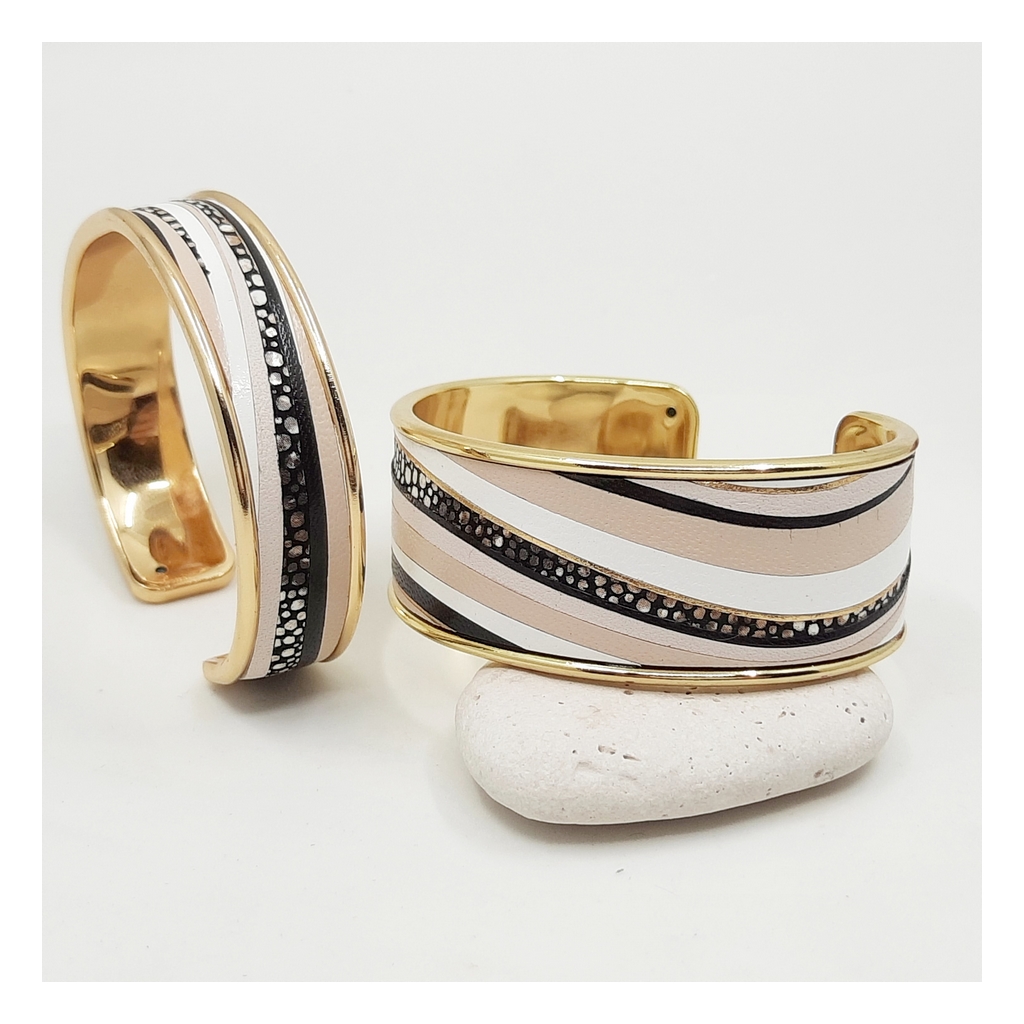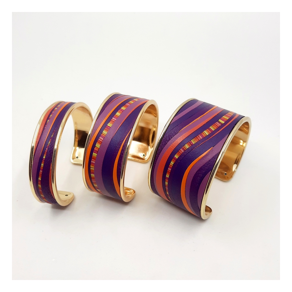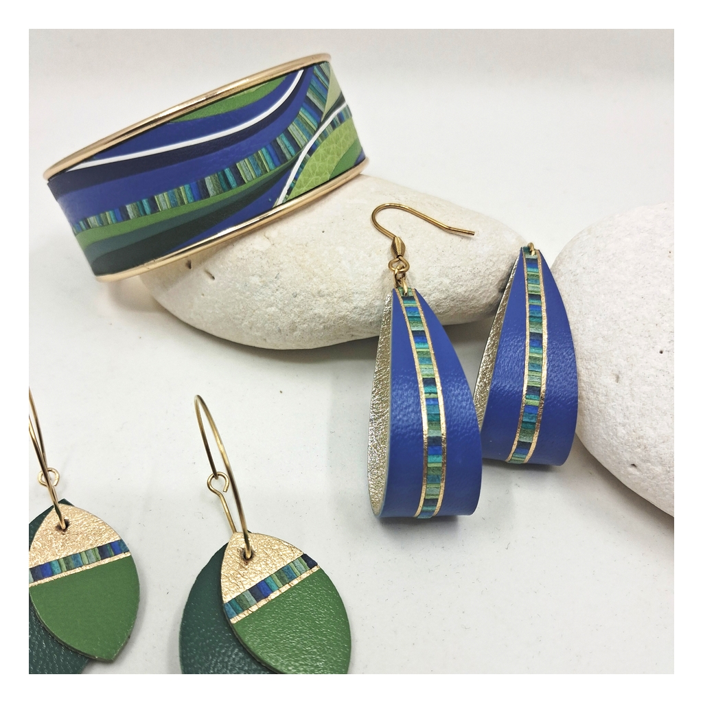 Délicatement confectionnés à la main, les bijoux en marqueterie de cuir sont déclinés en camaïeux et en nuances inspirées par la nature et les palettes de peintres. Les bracelets aux couleurs assorties peuvent être personnalisés d’un motif ou d’un symbole.