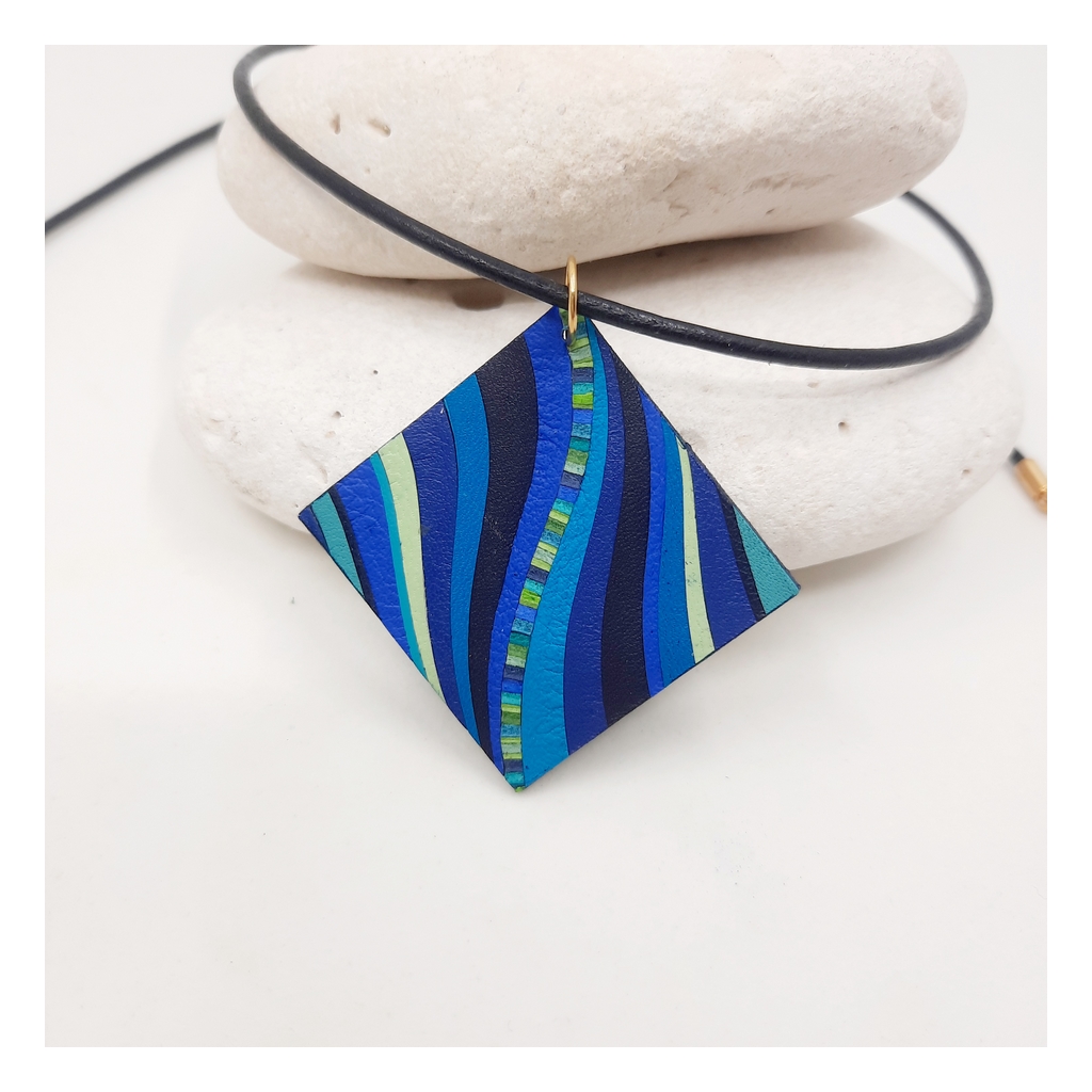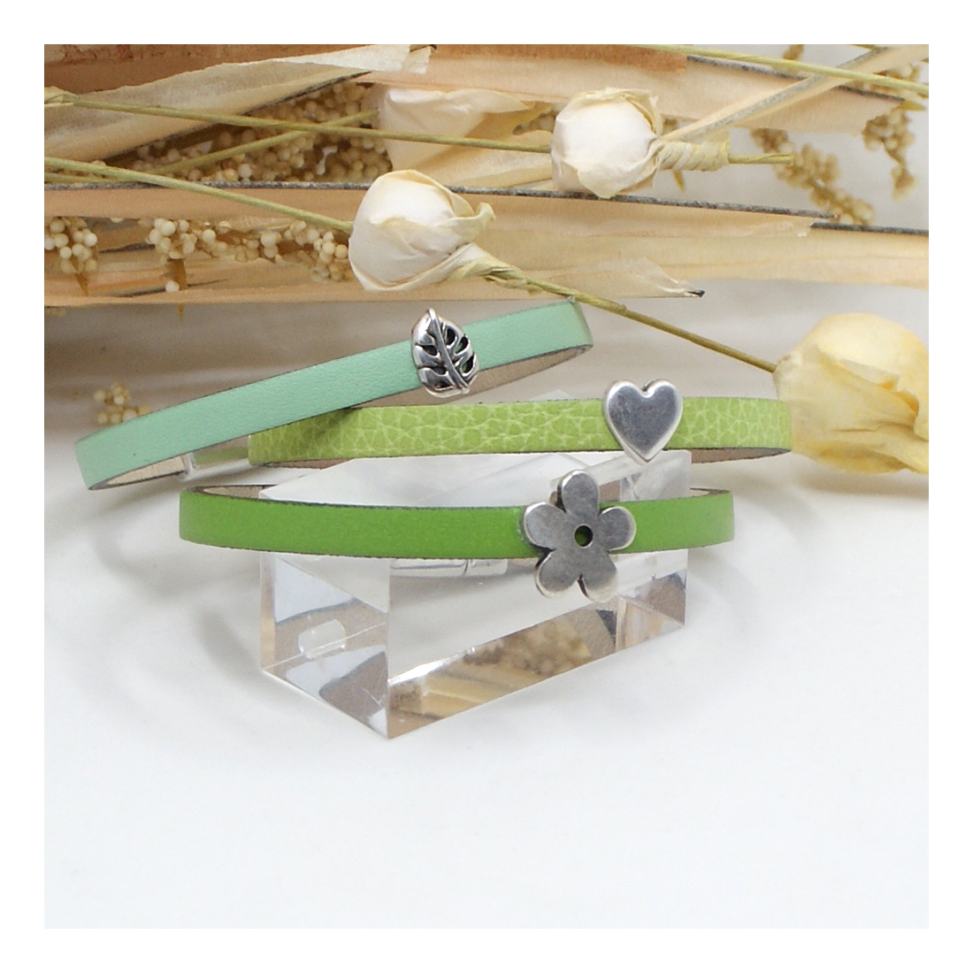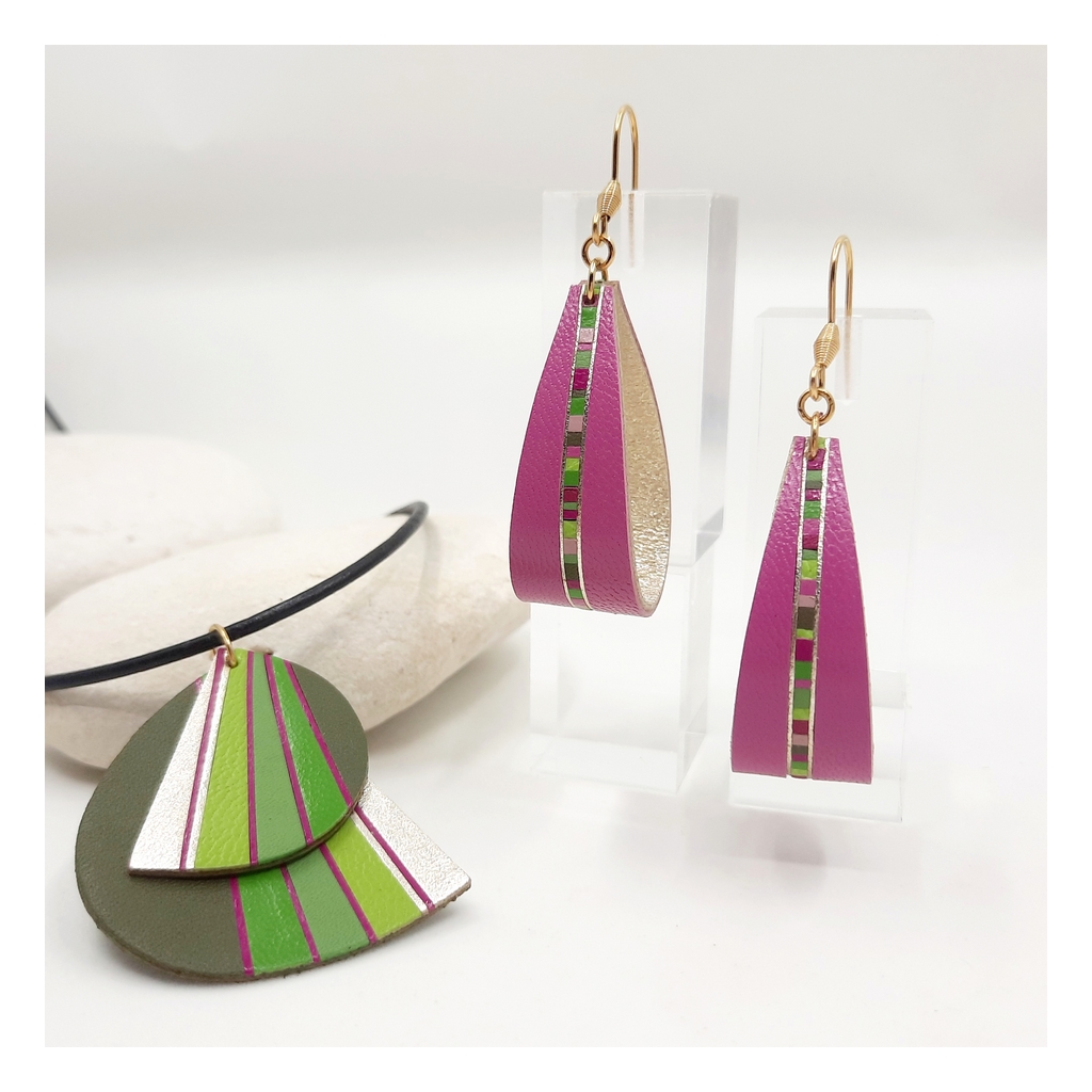 Délicatement confectionnés à la main, les bijoux en marqueterie de cuir sont déclinés en camaïeux et en nuances inspirées par la nature et les palettes de peintres. Les bracelets aux couleurs assorties peuvent être personnalisés d’un motif ou d’un symbole.